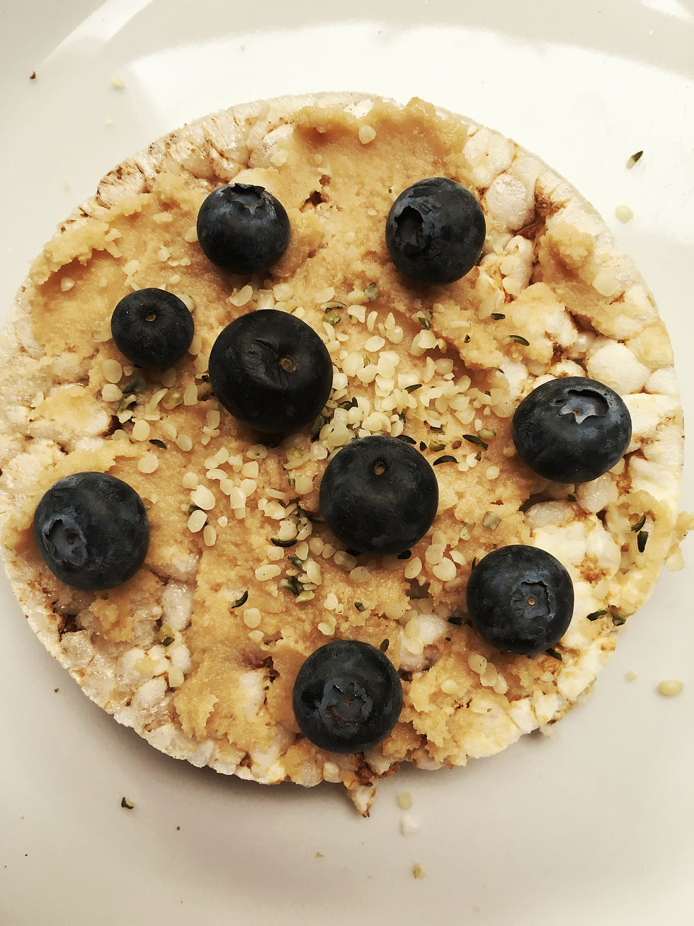 Unta la crema de cacahuate en el rice cake y cocola encima la fruta y semillas de hemp.